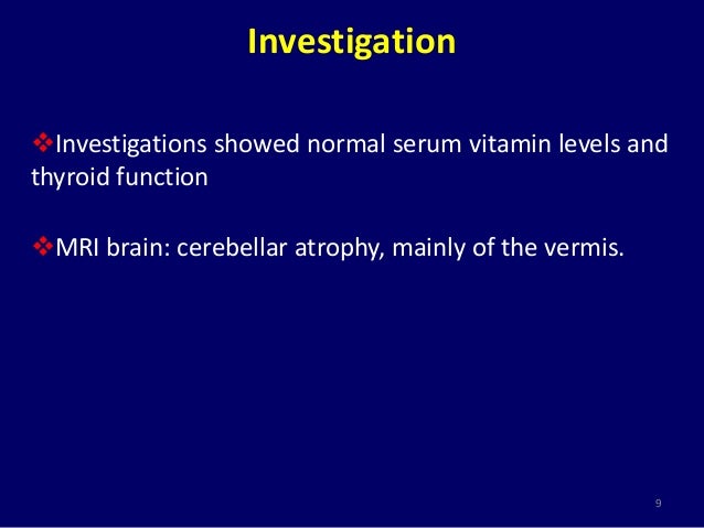Design Setting and Participants We examined a consecutive series of 76 patients presenting to a tertiary referral center for evaluation of chronic progressive cerebellar ataxia. Routine laboratory investigations as well as serum ceru- loplasmin 232mgl were within normal limits.
